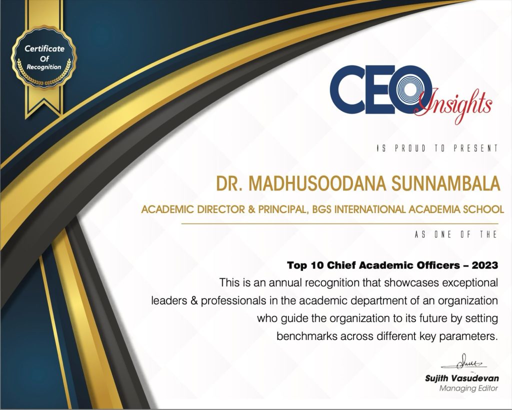 We are excited to share that our esteemed Principal Dr. Madhusoodana Sunnambala has been honored with TOP 10 Chief Academic officers-2023 from CEO Insights.